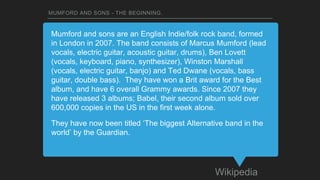 en.wikipedia.org › wiki › Mumford_&_SonsMumford & Sons - Wikipedia Mumford & Sons is a British folk rock band formed in London in 2007. The band currently consists of Marcus Mumford (lead vocals, electric guitar, acoustic guitar, drums), Ted Dwane (vocals, bass guitar, double bass), and Ben Lovett (vocals, keyboards, piano). Winston Marshall (banjo, electric guitar, resonator guitar, dobro) left the band in 2021.