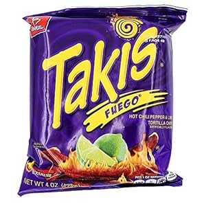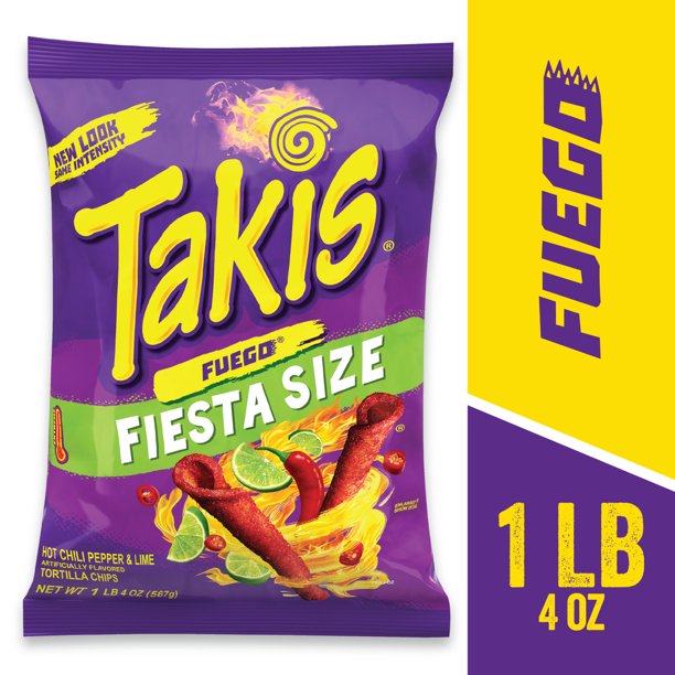 Takis Fuego Family Size Party Pack, 9.9 Oz (Pack of 3) Takis Fuego chips have only 150 calories per serving، Made from high-quality ingredients, starting with real corn mesa، rolled for fantastic crunch and easy snacking. Takis chips have 2g of protein per serving Free of Trans fat, cholesterol and sugars decent source of fiber. Product details Is Discontinued By Manufacturer : No