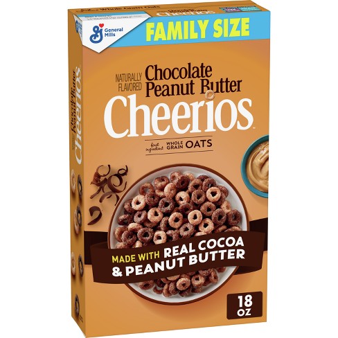 Nutrition Facts for Cheerios Chocolate Cereal • MyFoodDiary® Nutrition Facts ; Fat 12.7% ; Carbs 78.8% ; Protein 8.5% ... Cheerios Chocolate Peanut Butter Cereal (Large Size) - Giant Food Per 1 Cup Serving: 150 calories; 1 g sat fat (4% DV); 230 mg sodium (10% DV); 9 g total sugars. 19 g whole grain per serving at least 48 g recommended daily.