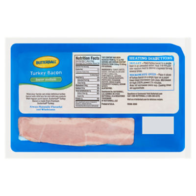 › products › turkey-baconOriginal Turkey Bacon | Butterball® Calcium 0% Saturated Fat 0.5g Cholesterol 10mg Dietary Fiber 0g Vitamin A 0% Vitamin C 0% Vitamin D 0% Ingredients: Turkey, Water, Salt, Sugar, Contains 2% or less of Canola Oil, Sunflower Oil, Natural Flavor, Sodium Phosphate, Potassium Acetate, Potassium Diacetate, Sodium Erythorbate, Sodium Nitrite. Preparation Recommended Heating Directions