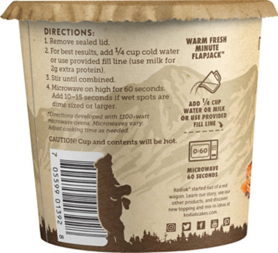 Calories in Kodiak Cakes Oatmeal Power Cup and Nutrition Facts - FatSecret 12g. in 1 container (55 g) of Kodiak Cakes Oatmeal Power Cup. Calorie breakdown: 15% fat, 62% carbs, 23% protein. Oatmeal Unleashed - Strawberry Dark Chocolate. Oatmeal Unleashed - Peach Vanilla Almond. Strawberries & Cream Oatmeal. Oatmeal Unleashed - Peanut Butter Chocolate Chip. Oatmeal Unleashed - Maple & Brown Sugar (Packet)