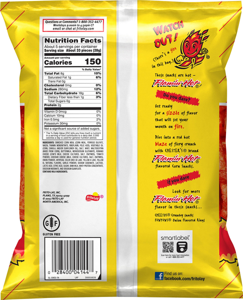 Flamin' Hot Cheetos Nutrition Facts - Eat This Much Nutrition Facts. For a Serving Size of 1 package. How many calories are in Flamin' Hot Cheetos? Amount of calories in Flamin' Hot Cheetos: Calories 170. Calories from Fat 72 ( 42.4 %) Cheetos Flamin' Hot Popcorn Flavored Snacks, 6.5 oz Bag Tomorrow Buy Cheetos Flamin' Hot Popcorn Flavored Snacks, 6.5 oz Bag at business.walmart.com Breakroom ... Calories 160. Amount per serving % Daily Value* Total Fat 11g: 14%: ... smooth, cheesy flavor you know and love from classic CHEETOS. Ready to go right out of the bag, it's popcorn with an added boost of cheesy mischievous flavorful fun ... Amazon.com: Hot Cheetos Big Bag Cheetos Crunchy Flamin' Hot, 15oz Party Size Bag 15 Ounce (Pack of 1) 97 Cheetos Crunchy, Flamin' Hot, 15oz Party Size! Bag 15 Ounce (Pack of 1) 3,276 Cheetos Crunchy Flamin' Hot Cheese Flavored Snacks, 8.5 Ounce 8.5 Ounce (Pack of 1) 13,257 Amazon's Choice Cheetos Flamin' Hot Crunchy 2.0 oz (Pack of 5) 2 Ounce (Pack of 5) 871 $988 ($0.99/Ounce)