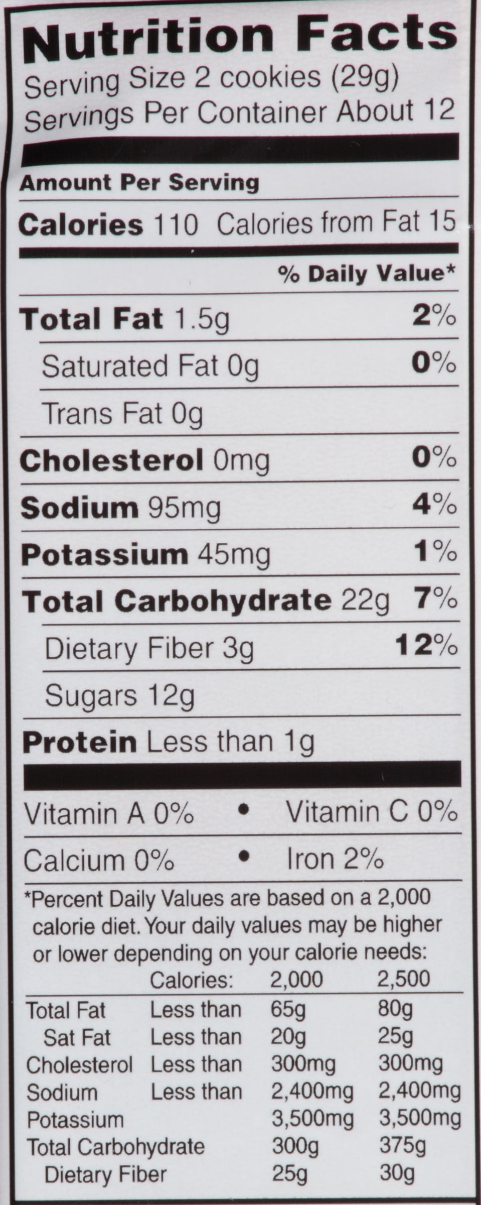 Nabisco Fig Newtons Allergy and Ingredient Information - Allergen Inside Nutrition Label Nutrition Facts Serving Size 2.00 cookies Amount Per Serving Calories 110 Calories from Fat 20 % Daily Value* Total Fat 2g 3.07% Saturated Fat 0g 0% Cholesterol 0g 0% Sodium 0.1g 4.16% Potassium 0.075g 2.14% Total Carbohydrates 21g 7% Dietary Fiber 1g 4% Sugars 12g Protein 1g Vitamin A 0% Vitamin C 0% Calcium 2% Iron 4%