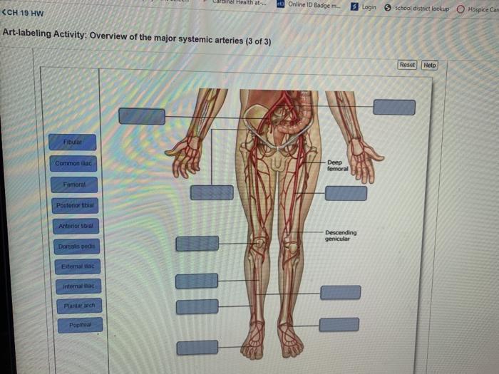 [Solved] Art-Labeling Activity: The major systemic | SolutionInn Dec 14, 2012 · Art-Labeling Activity: The major systemic arteries Part A Drag the appropriate labels to their respective targets. Common iliac artery Brachial artery Ulnar artery Internal iliac artery Femoral artery Popliteal artery Celiac trunk Radial artery Descending aorta Axillary artery Brachiocephalic artery External iliac artery Left subclavian artery Common carotid artery Arteries of the head and ...